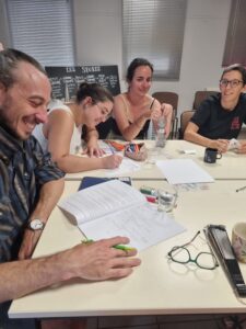 Puis, retour en petit groupe pour sélectionner une forme et l’affiner, la préciser mais également pour (se projeter) s’imaginer en train de jouer cette forme dans la réalité. Il y a à nouveau un retour en grand groupe pour discuter de ces (nouvelles idées) propositions plus abouties et se donner des (conseils) avis, des suggestions les un·es et les autres. La compagnie anime la discussion et prodigue quelques recommandations (et les deux groupes présentent leurs formes).